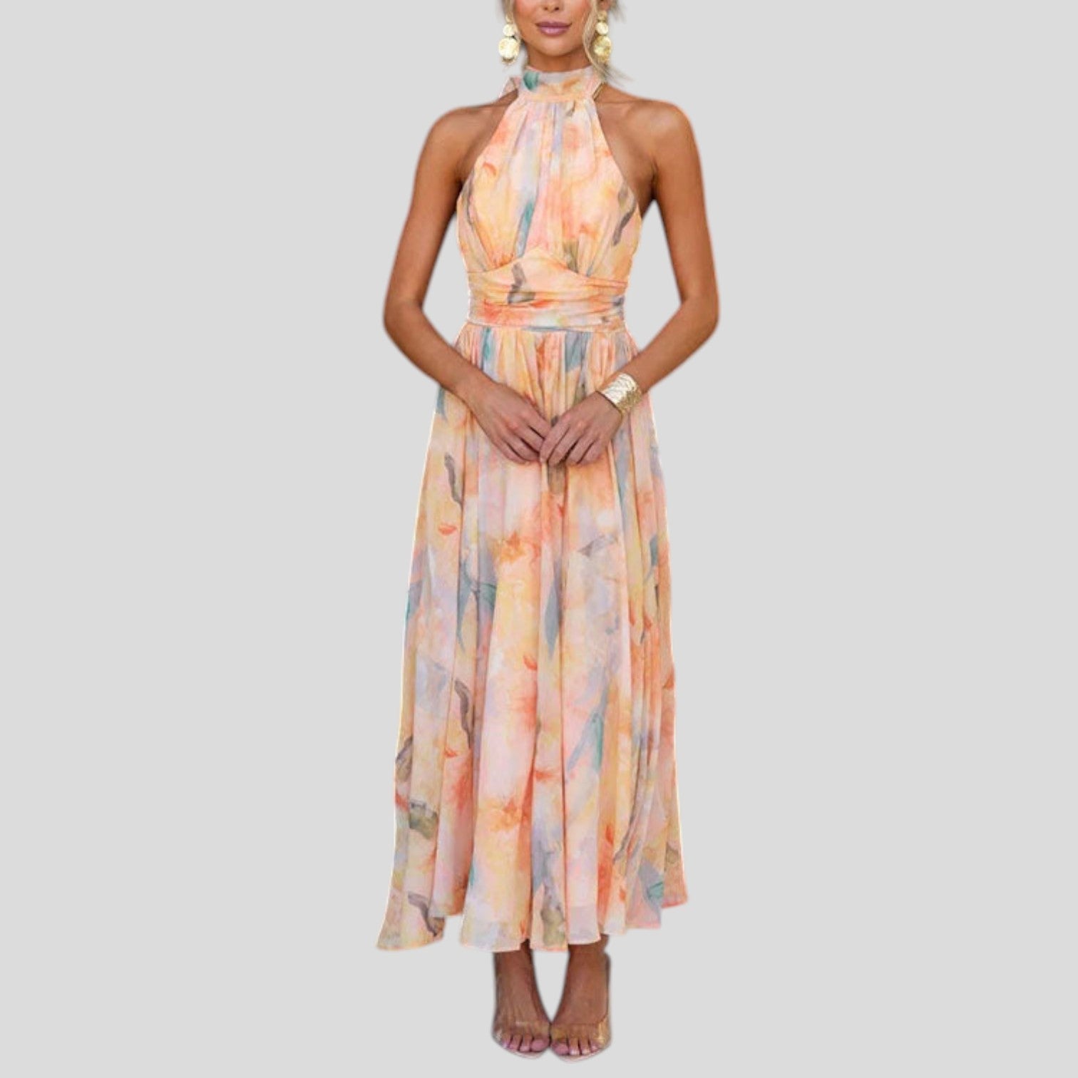 Con Gina ogni apparizione diventa un momento speciale: un maxi abito come un sogno estivo, creato per giornate soleggiate e notti magiche. L'elegante scollo all'americana e la schiena scoperta uniscono femminilità senza tempo e disinvolta leggerezza. La vita delicatamente accentuata e il design fluido in colori acquerellati rendono Gina il tuo abito preferito per momenti indimenticabili.