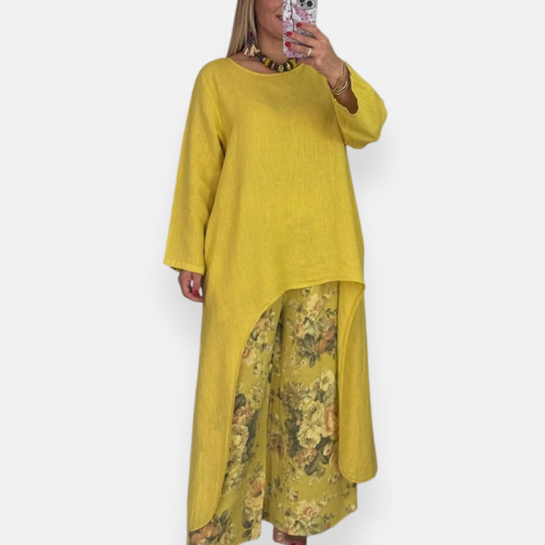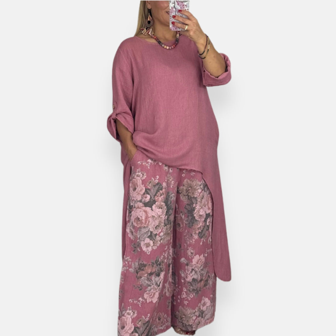 Comodità ed eleganza si incontrano in Isabella, l’ensemble due pezzi dal fascino rilassato e femminile. La tunica lunga a taglio asimmetrico si abbina armoniosamente al pantalone ampio con stampa floreale, creando una silhouette fluida e raffinata. Perfetto per le giornate estive informali o per uscite all’aperto con stile naturale.