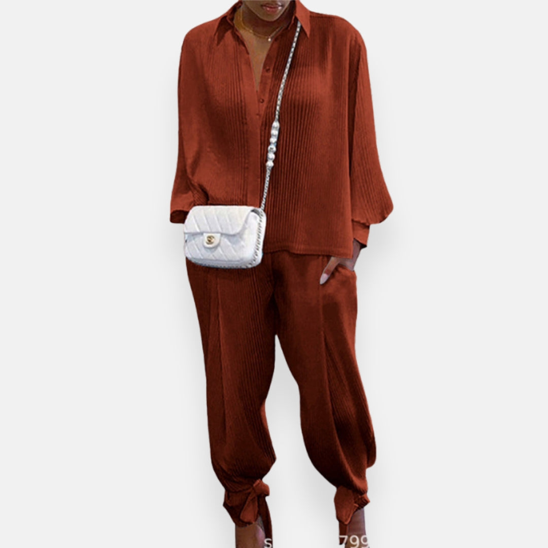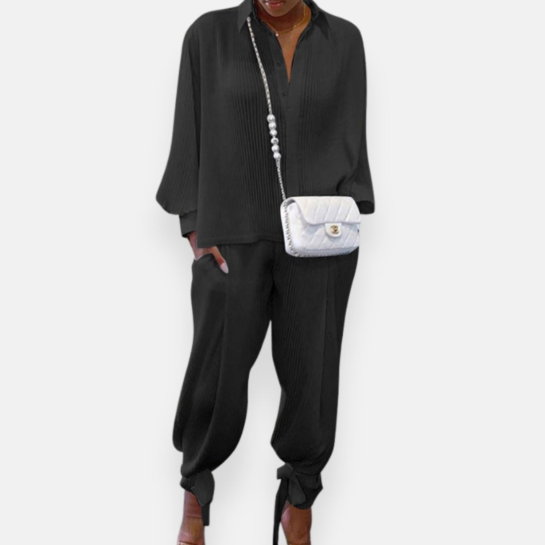 Eleganza pura in chiave minimalista. Il completo Beatrice, realizzato in leggero tessuto plissé, unisce comfort e raffinatezza in un design senza tempo. La camicia ampia assicura una vestibilità ariosa e rilassata, mentre il pantalone con dettaglio annodato alle caviglie dona un tocco moderno e femminile. Perfetto per affrontare l’estate con uno stile casual chic e sofisticato.
